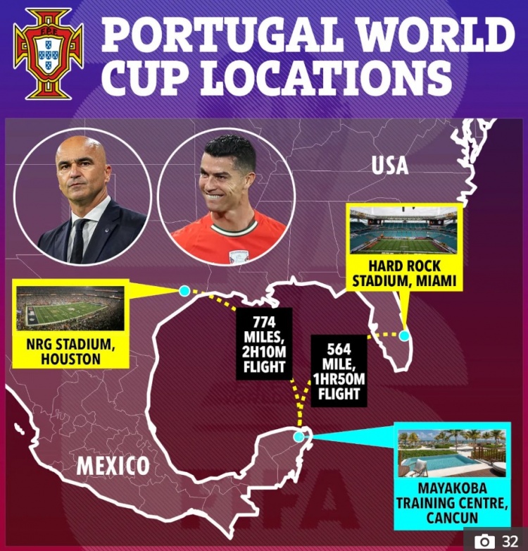 尽管葡萄牙队在墨西哥没有任何比赛,C罗和他的队友们还是选择了墨西哥的派对之都坎昆作为他们的世界杯基地。葡萄牙队在小组赛中将与哥伦比亚、乌兹别克斯坦以及刚果民主共和国、牙买加或新喀里多尼亚之一进行较量。